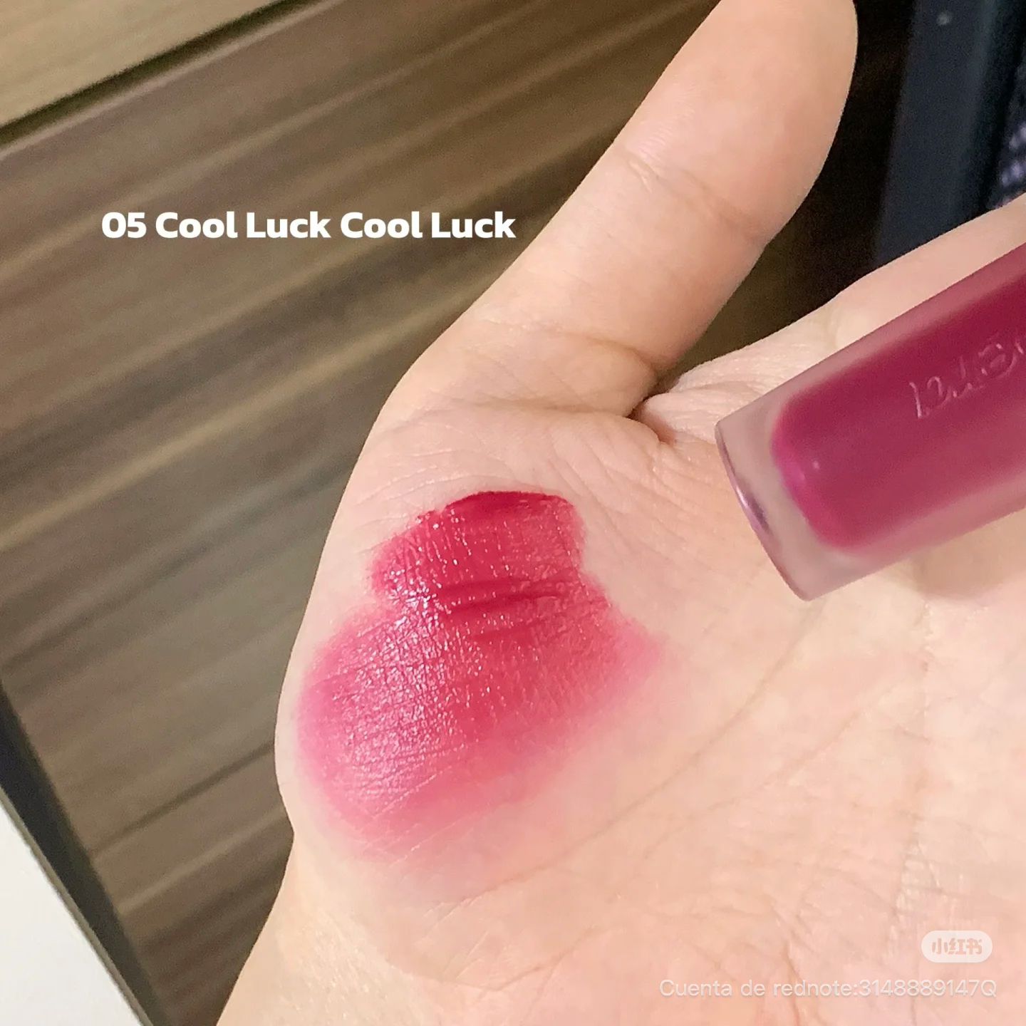Por otro lado, el tono #05 Cool Luck Cool Luck es un ciruela rojo frío, ideal para quienes buscan un toque de sofisticación o profundidad en los labios. Este tono resalta en pieles frías y es ideal para looks nocturnos o llamativos.